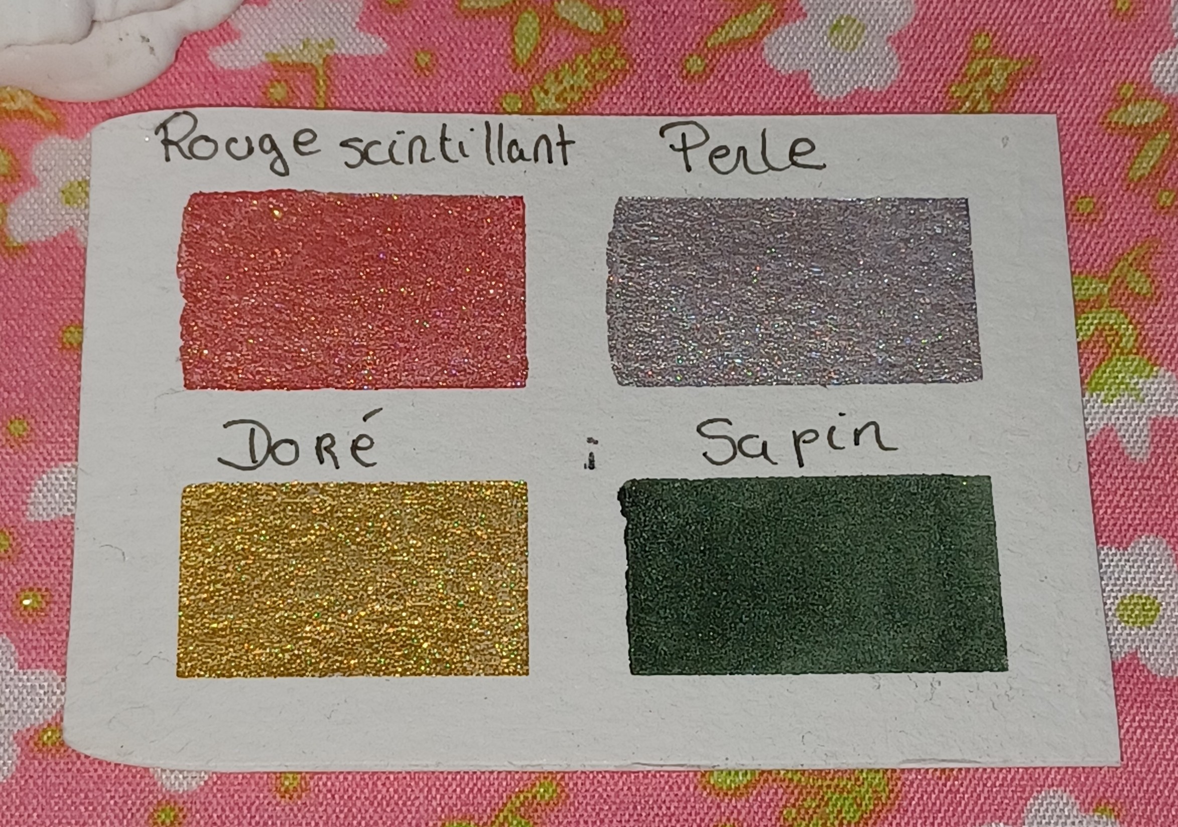 La palette est composé de 4 couleurs: Perle, Doré, Sapin et Rouge scintillant